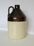 This vintage crock is a beautiful piece, featuring a dual-tone design with a light tan bottom half and a dark brown top. It also comes with a convenient handle for easy handling.